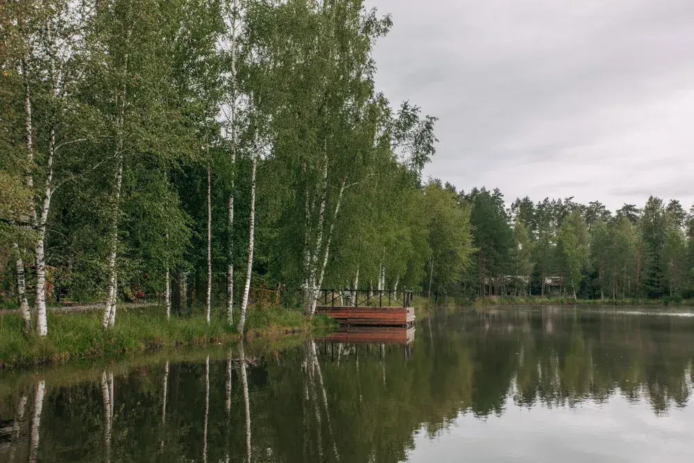 - Ивент-локации у воды: пирс площадью около 200 м², две крытые беседки у пруда по 40 м², зелёная поляна, береговые виды для неформального общения и фотосессий.